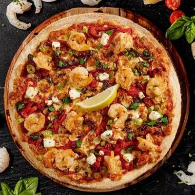 12" Large. Marinated Prawns, Roasted Capsicum, Sun-Dried Tomatoes, Feta Crème & Shallots, 100% Australian Mozzarella on our Signature Sugo Pomodoro (Tomato) Base, Garnished with Parsley & a Lemon Wedge