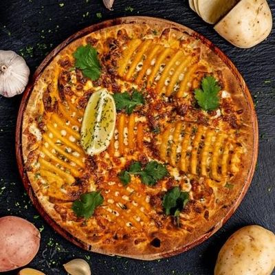 12" Large. Premium Slow Cooked Lamb, Spanish Onions, Topped with Roast Potatoes & Fior Di Latte Mozzarella on a Mixture of our Signature Sugo Pomodoro (Tomato) & Bechamel bases, Garnished with Buttermilk Ranch & Chives