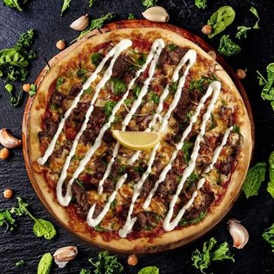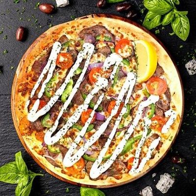 12" Large. Slow Cooked Roast Lamb in Souvlaki Spices, Fresh Capsicum, Spanish Onions, Roasted Tomatoes, Feta Crème & Fior Di Latte Mozzarella on a Garlic Confit Base, Garnished with Tzatziki Yoghurt, Oregano & a Lemon Wedge