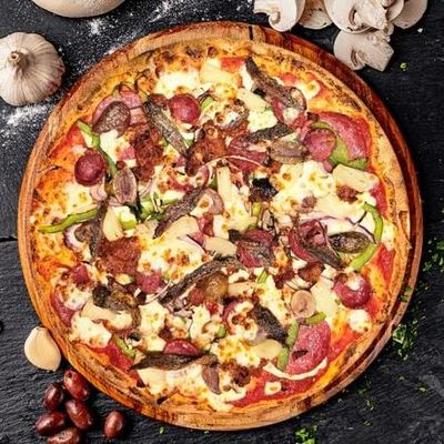 12" Large. Wagyu Beef Salami, Smoked Turkey Ham, Calabrese Beef Pepperoni, Mushrooms, Fresh Capsicum, Spanish Onions, Pineapple, Kalamata Olives & Fior Di Latte Mozzarella on our Signature Sugo Pomodoro (Tomato) Base (Add Anchovies $3)