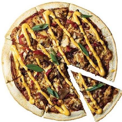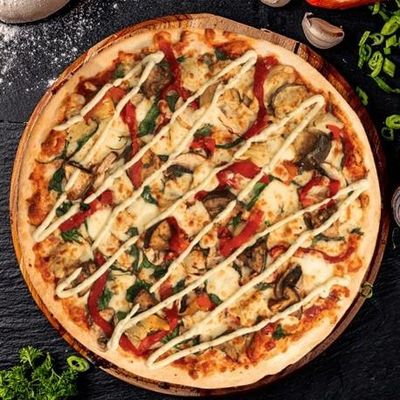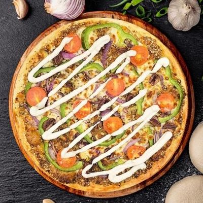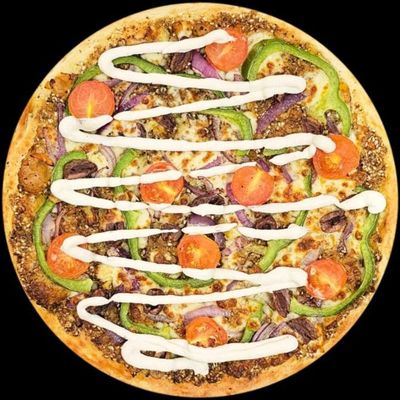 12" Pizza. Australian Vegan Mozzarella topped with Mushroom, Fresh Capsicum, Spanish Onions, Roasted Tomatoes & Kalamata Olives on a Za’atar (Oregano Dukkah) base, Garnished with Vegan Aioli