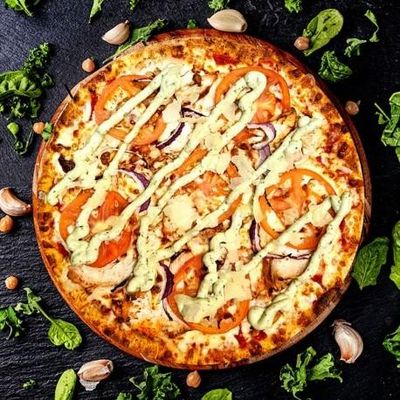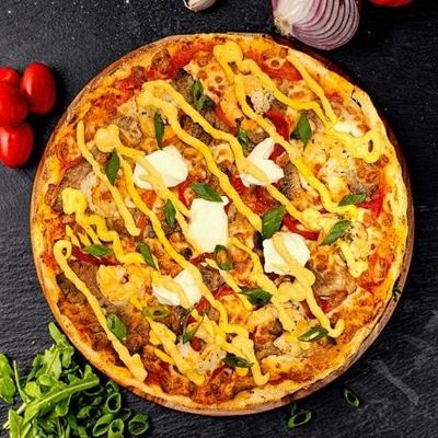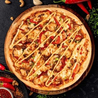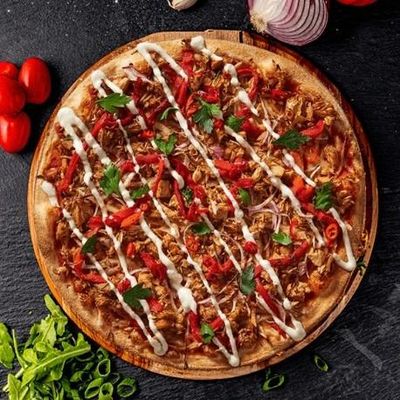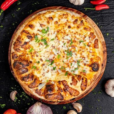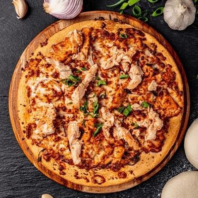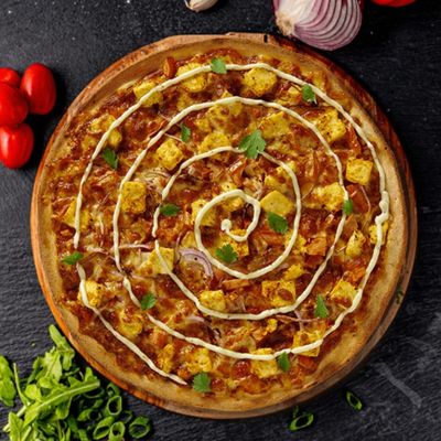 12" Large. House Cooked Chicken topped with Fresh Capsicum, Spanish Onion & 100% Australian Mozzarella on a Tikka Masala base, Garnished with Herb Yoghurt
