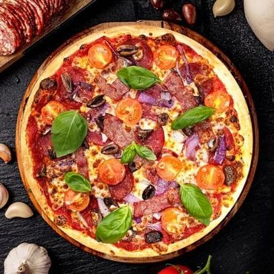 12" Large. Wagyu Beef Salami, Roasted Tomatoes, Spanish Onions, Kalamata Olives, Angus Beef Rashers & Fior Di Latte Mozzarella on our Signature Sugo Pomodoro (Tomato) Base mixed with Garlic Confit. Garnished with Shaved Reggiano Parmigiano & Fresh Basil