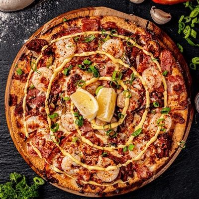 12" Large. Marinated Prawns in Southern Tennessee Spices, Roasted Capsicum, Spanish Onions, Shallots topped with Angus Beef Rashers, Fior Di Latte Mozzarella on a Tomato Salsa Base, Garnished with Smokey Chipotle Ranch Sauce