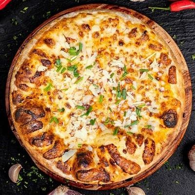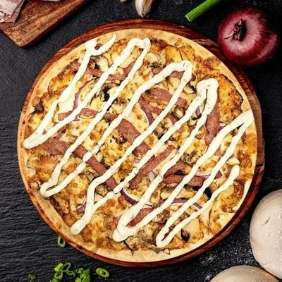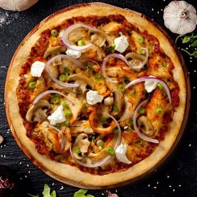 12" Large. House Cooked Chicken in Southern Tennessee Spices, Mushrooms, Spanish Onions & Fior Di Latte Mozzarella on a Smokey BBQ Base, Topped with Angus Beef Rashers & Garnished with Buttermilk Ranch Sauce