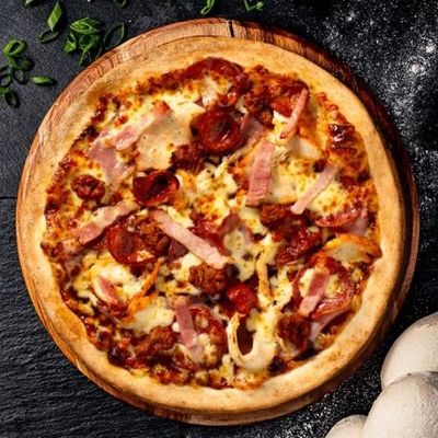 12" Large. Wagyu Beef Salami, Smoked Turkey Ham, Calabrese Beef Pepperoni, House Cooked Chicken, House Cooked Ground Beef, Angus Beef Rashers & Fior Di Latte Mozzarella on a Smokey BBQ Base