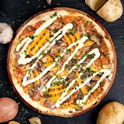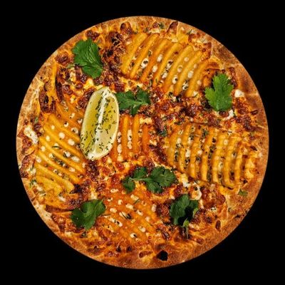 12" Pizza. 100% Australian Mozzarella topped with Oven Roasted Waffle Fries on a Garlic Confit base, Garnished with Italian Herbs, Basil & Extra Virgin Olive Oil