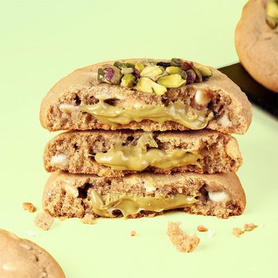 A soft, gooey New York-style cookie crafted with premium pistachios and white chocolate. Each cookie features a creamy pistachio filling, luscious white chocolate chunks, and chunky pistachios for an irresistible nutty crunch