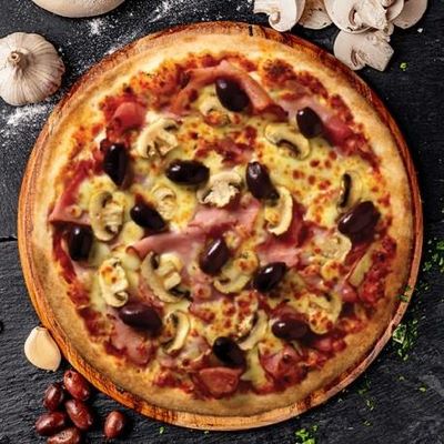 12" Large. Smoked Turkey Ham, Mushrooms, Kalamata Olives & Fior Di Latte Mozzarella on our Signature Sugo Pomodoro (Tomato) Base (Add Anchovies $3)