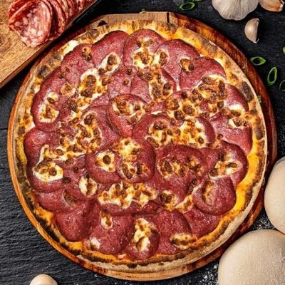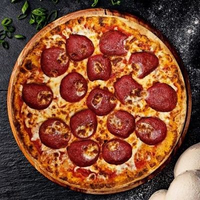 12" Large. Turkish Salami, Roasted Capsicum & Fior Di Latte Mozzarella on our Signature Sugo Pomodoro (Tomato) Base, Garnished with Parsley and a Lemon Wedge