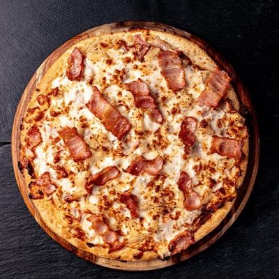 12" Large. House Cooked Ground Beef, Angus Beef Rashers, Spanish Onions & Fior Di Latte Mozzarella on a Smokey BBQ Base