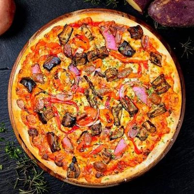 12" Large. Oven Roasted Eggplant, Roasted Capsicum, Spanish Onions, Kalamatta Olives & 100% Australian Mozzarella on Our Signature Sugo Pomodorro (Tomato) Base, Garnished with Hot Honey
